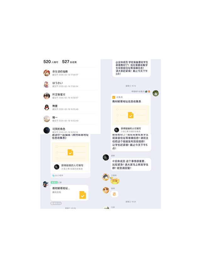 为了教材能及时投递,高一、高二两位年级组长立刻创建了“教材邮寄地址信息征集表”,并通知给各班主任。高一、高二26位班主任在接到通知后第一时间响应,当即行动,及时向班级学生转发“教材邮寄地址信息征集表”,争取迅速上报。