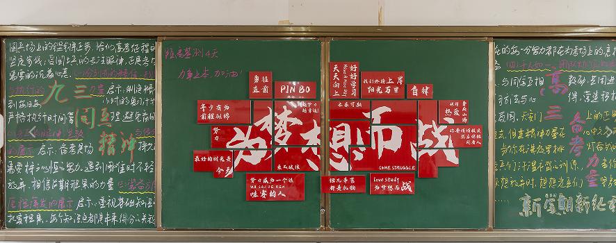 高二班级在布置上更显沉稳与深度。“见山”“听风”等书法作品与“自律坚持”等励志标语,被精心悬挂在教室墙面,时刻提醒着同学们在承上启下的关键学年,要以自律为帆,以坚持为桨,在知识的海洋中奋勇前行。黑板报聚焦“无奋斗,不青春”,用充满力量的文字与设计,诠释青春与奋斗的紧密关联,鼓励大家在青春岁月里拼搏进取,行稳致远。