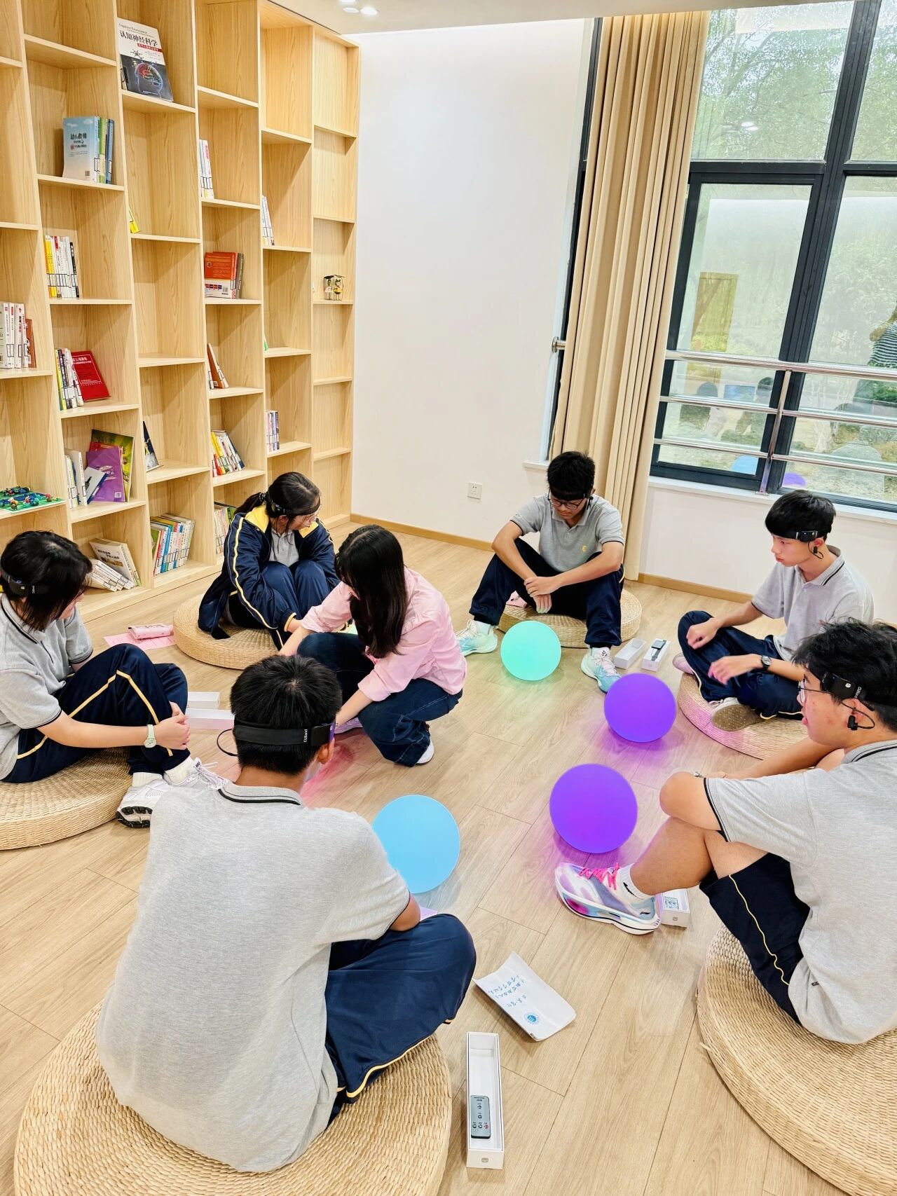 随后进入核心打卡阶段。在脑波球体验区,脑波球通过灯光颜色变化,实时反馈并引导学生调节情绪;“快乐芯”配合音乐与画面,帮助学生科学放松、缓解焦虑;VR训练则借助沉浸式场景,有效释放压力、疗愈心灵。